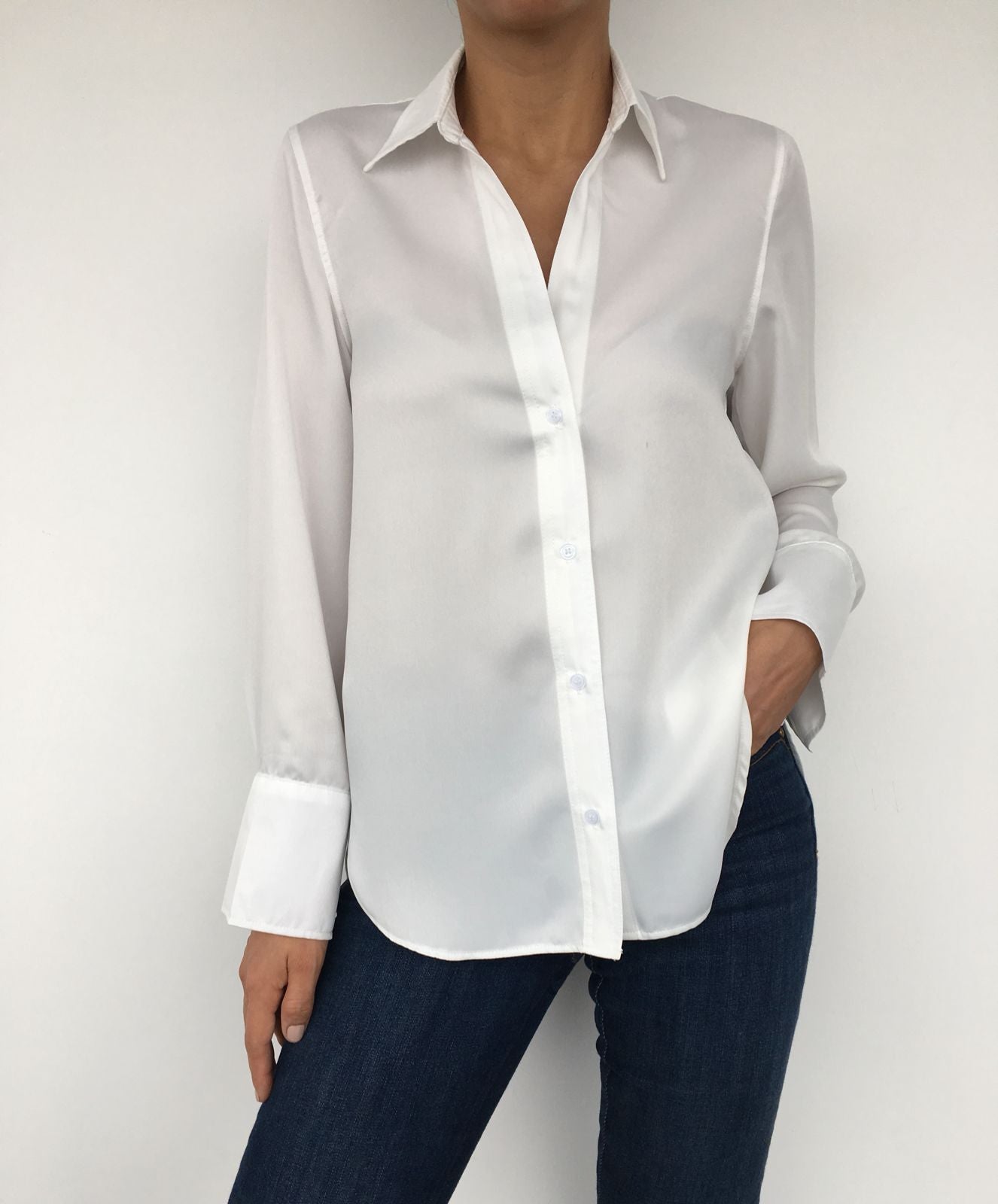 Esta blusa Gioconda es perfecta para cualquier ocasión. Confeccionada en satén, su cuello solapa y escote pico le dan un toque elegante, mientras que su manga larga y bajo asimétrico con aberturas laterales la hacen casual y moderna. ¡No te pierdas esta prenda versátil y chic!