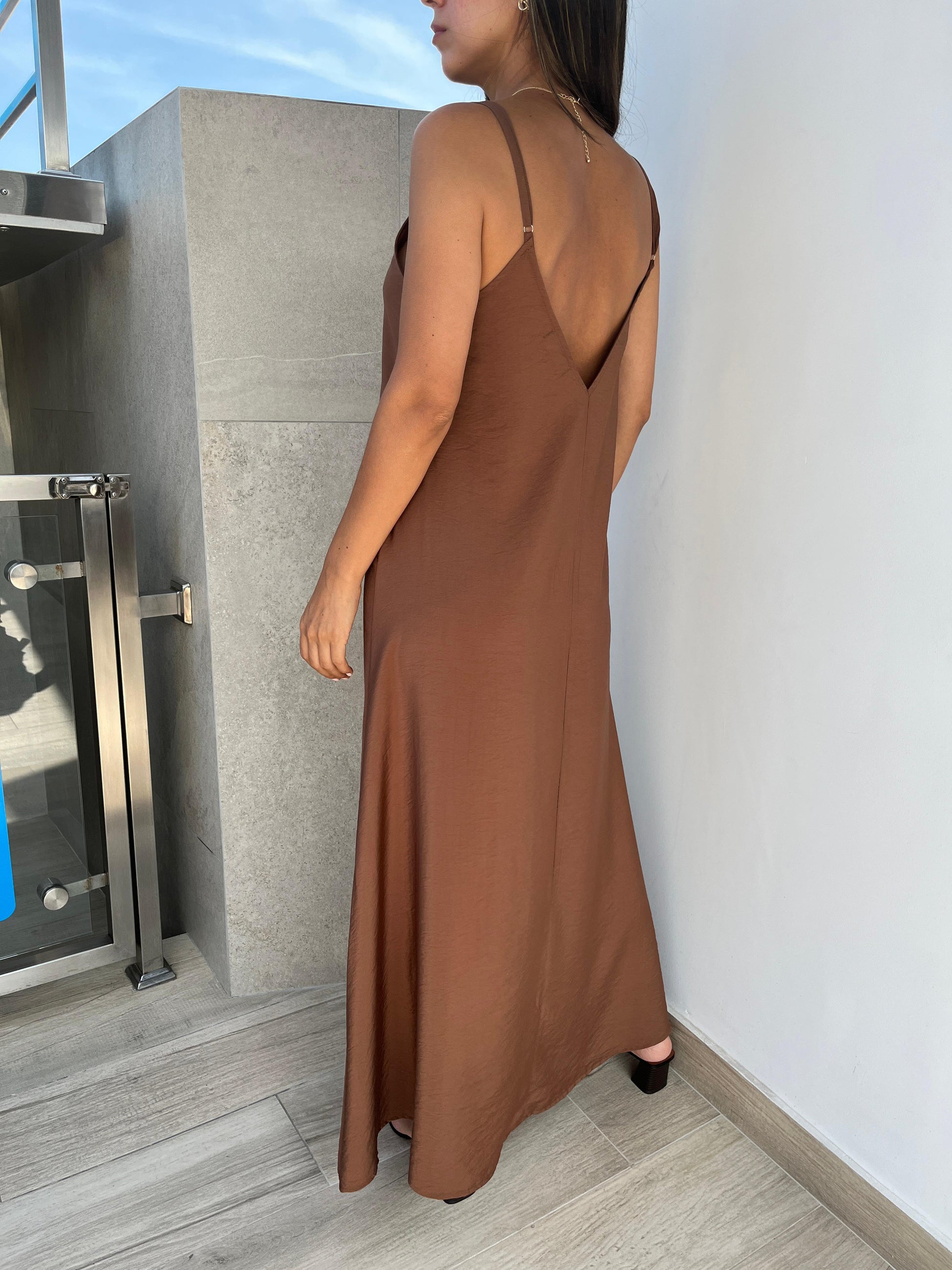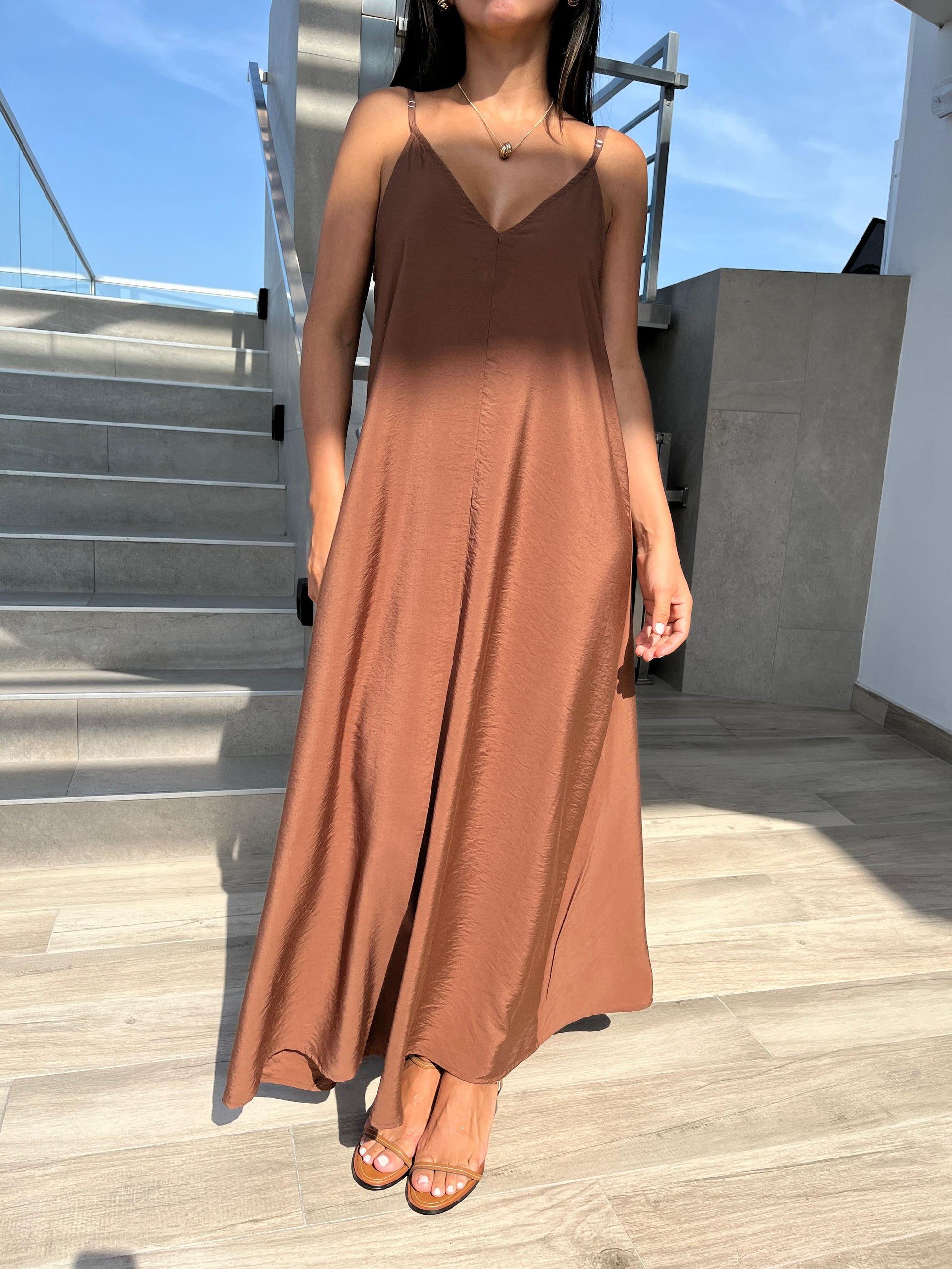 Este impresionante vestido maxi en colores enteros presenta un favorecedor escote en V y delicados tirantes finos. Perfecto para días cálidos y noches frescas.